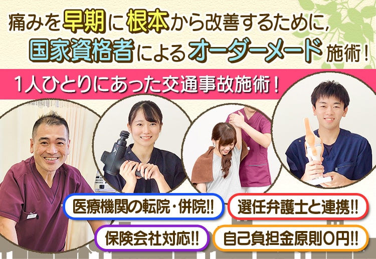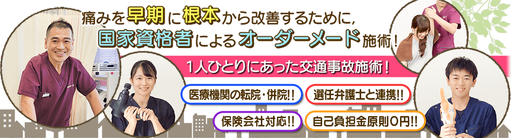 早期改善だけでなく、根本改善も目指した施術をおこなわせていただきますので、交通事故のケガが残ることにご不安がある方もぜひご相談ください。